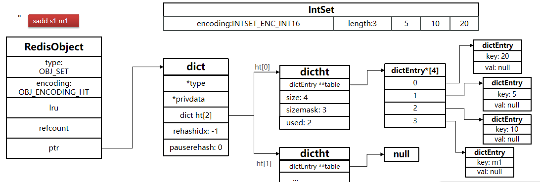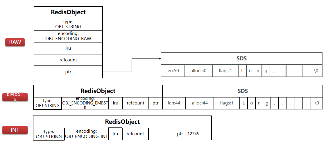 - 更节省内存: key是string类型,底层编码包含int、embstr和raw三种。embstr在小于44字节使用,采用连续内存空间,内存占用更小。当字节数大于44字节时,会转为raw模式存储,在raw模式下,内存空间不是连续的,而是采用一个指针指向了另外一段内存空间,在这段空间里存储SDS内容,这样空间不连续,访问的时候性能也就会收到影响,还有可能产生内存碎片