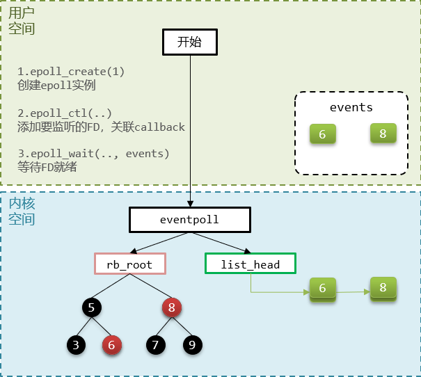 就去等待,在用户态创建一个空的events数组,当就绪之后,我们的回调函数会把数据添加到list_head中去,当调用这个函数的时候,会去检查list_head,当然这个过程需要参考配置的等待时间,可以等一定时间,也可以一直等, 如果在此过程中,检查到了list_head中有数据会将数据添加到链表中,此时将数据放入到events数组中,并且返回对应的操作的数量,用户态的此时收到响应后,从events中拿到对应准备好的数据的节点,再去调用方法去拿数据。