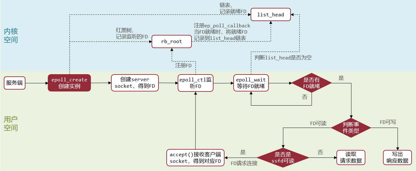 - 每个FD只需要执行一次epoll_ctl添加到红黑树,以后每次epol_wait无需传递任何参数,无需重复拷贝FD到内核空间
