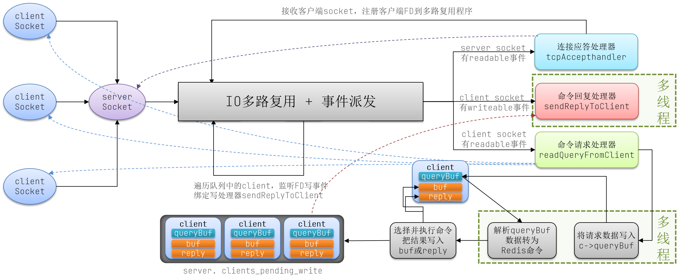 当客户端想要去连接服务器,会先到IO多路复用模型进行排队,此时会有一个连接应答处理器接受读请求,然后又把读请求注册到具体模型中去,此时这些建立起来的连接,如果是客户端请求处理器去进行执行命令时,他会去把数据读取出来,然后把数据放入到client中, clinet去解析当前的命令转化为redis认识的命令,接下来就开始处理这些命令,从redis中的command中找到这些命令,然后就真正的去操作对应的数据了,当数据操作完成后,会去找到命令回复处理器,再由他将数据写出。